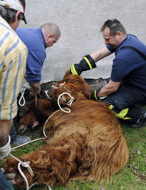 3月18日,德國一頭蘇格蘭高地牛來到一居民院內懶洋洋的曬太陽,最后經過獸醫的麻醉和消防員協力才將這頭蠻力十足的家伙“制服”。圖片來源:中國新聞網