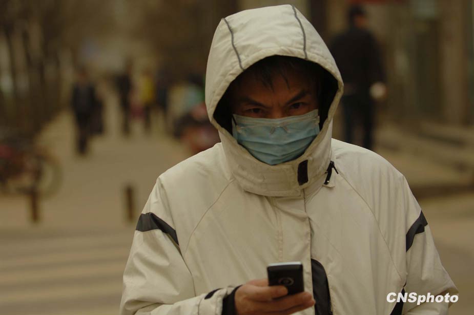 3月20日,春季首場重度浮塵天遮蓋了整個北京城。圖為北京市民在街頭“全副武裝”。中新社發 鄒憲 攝