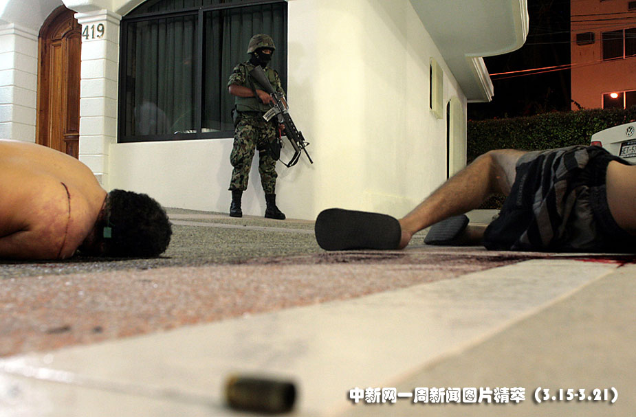 15日(周一),在墨西哥阿卡普爾科一家酒店內,兩名涉嫌販毒人在一場槍戰中身亡。一名墨西哥士兵正在把守現場。