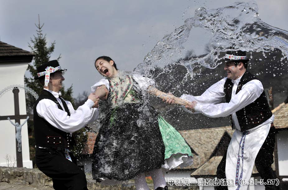 3月26日,在匈牙利首都布達佩斯以東被譽為世界文化遺產的霍洛克村,當地居民以向姑娘身上潑水的傳統儀式慶祝復活節。圖片來源:中國新聞網>>點擊觀看詳細內容