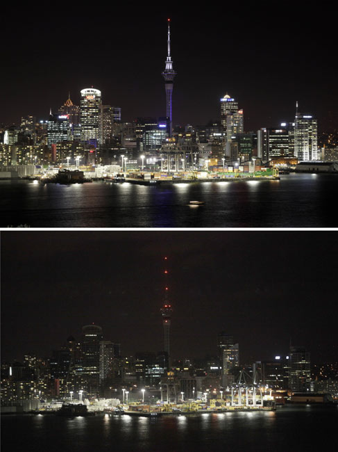 由世界自然基金會(huì)發(fā)起的“地球一小時(shí)”環(huán)保活動(dòng)27日20點(diǎn)30分按照時(shí)區(qū)依次在全球數(shù)千個(gè)城市展開。圖為新西蘭天空塔在熄燈前和熄燈后的景色。