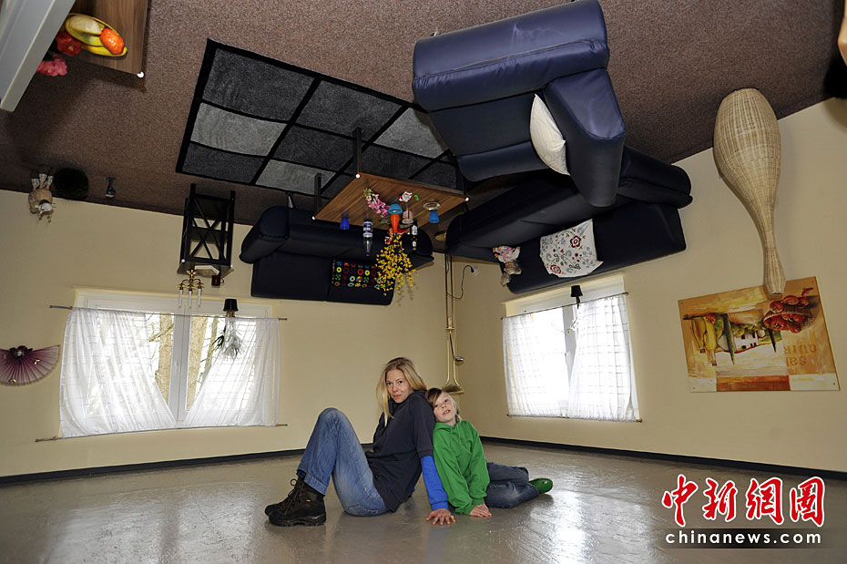 3月30日,德國蓋托夫市“瘋狂的房子”面向公眾開放。該房屋整個顛倒里面的家具也是被釘在屋頂上的。圖片來源:中國新聞網(wǎng)