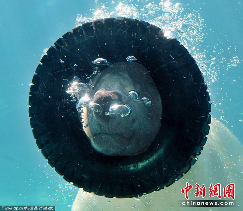 美國Asheboro北卡羅來納動(dòng)物園一頭名叫威利的北極熊可是個(gè)“活寶”。任何一個(gè)可用的東西都能成為它在鏡頭前“耍寶”的玩具。圖片來源:CFP