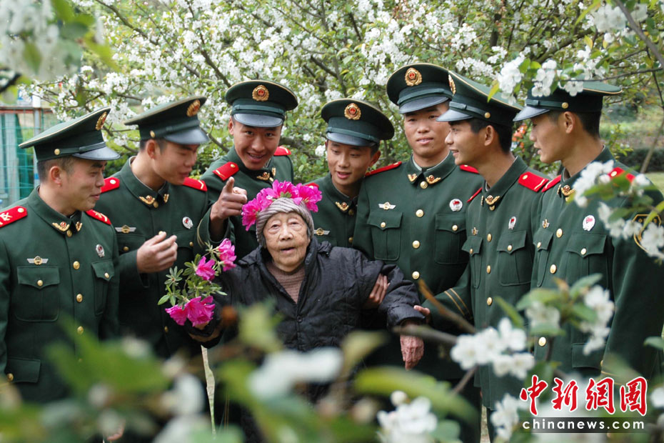 4月4日, 武警浙江省溫嶺市中隊(duì)10多位剛下中隊(duì)的新兵們,首次專門帶孤寡老人林文錦到城郊踏春游。當(dāng)日,新兵們商定派代表扶奶奶去“春游”。93歲的林文錦奶奶開心地說:“今天,是第33次短途‘春游’。中新社發(fā) 江勇兵 攝