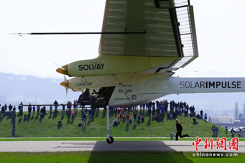 當地時間4月7日上午,全球首架依靠太陽能驅動的飛機進行首次試飛,預計此種新型飛機將在2011年實現環球航行。圖片來源:中國新聞網