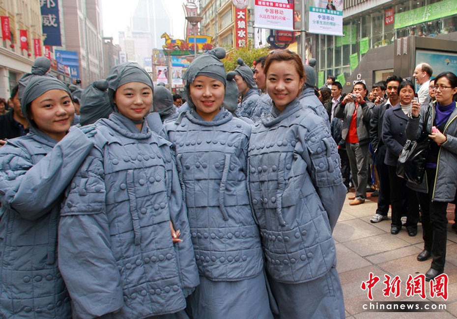 來自兵馬俑故鄉(xiāng)的百人表演隊伍,身著灰色的兵馬俑服裝,以鏗鏘的節(jié)奏、雄壯的氣勢,在上海南京東路步行街和東方明珠廣場游演。