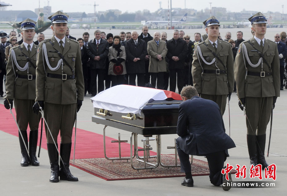 4月10日,卡欽斯基乘坐專機(jī)從華沙飛往俄羅斯斯摩棱斯克市,參加卡廷森林事件70周年紀(jì)念活動。途中飛機(jī)在斯摩棱斯克“北方”軍用機(jī)場附近降落時(shí)失事,共造成包括卡欽斯基夫婦及眾多政府高官在內(nèi)的96人死亡。慘劇發(fā)生后,舉世震驚。圖為波蘭總理圖斯克在卡欽斯基遺體前跪拜。