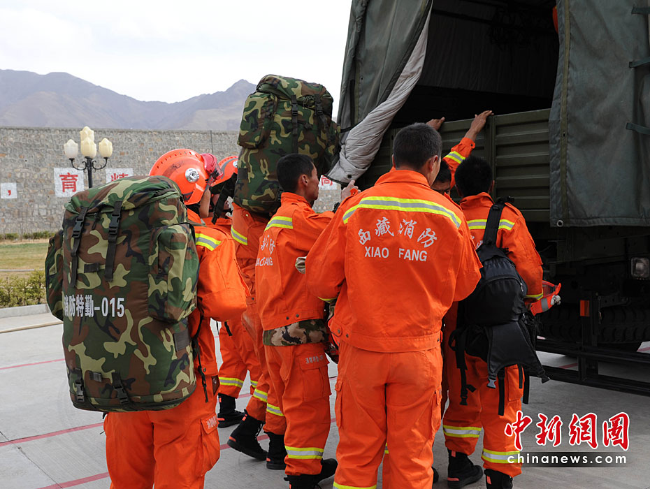 圖為4月14日下午17時50分,西藏消防總隊并西藏自治區地震災害緊急救援總隊派出直屬特勤大隊30名官兵、3輛救援跨區域遠距離增援玉樹地震災區。中新社發 陶盛楷 攝