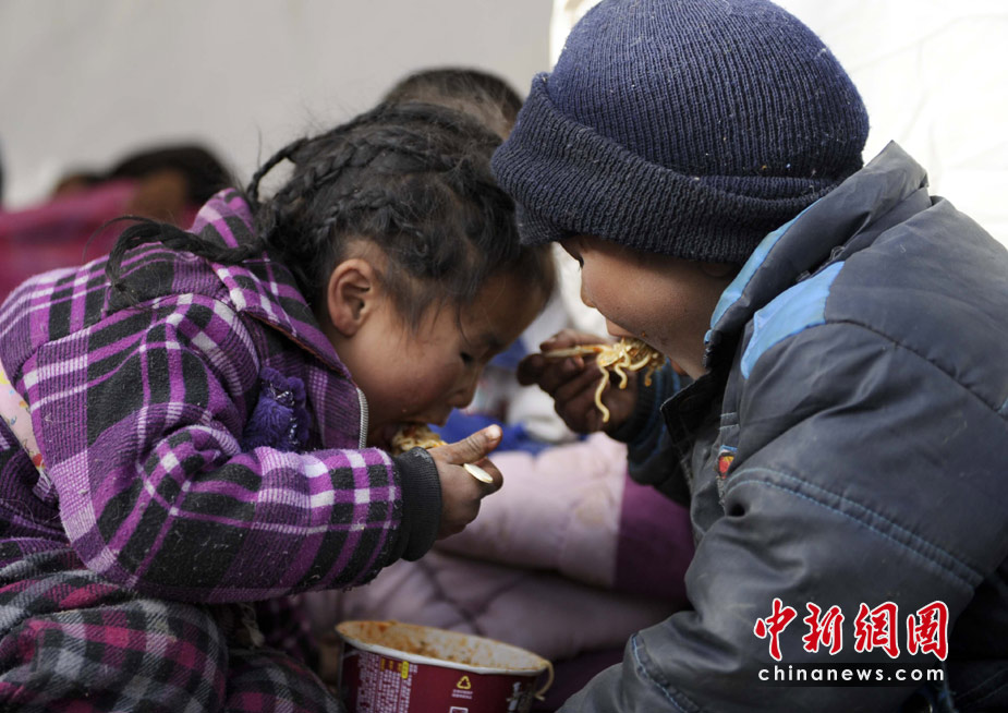 4月15日,青海玉樹縣體育場的地震災民安置點,兩名受災孩童分食一盒方便面,一根不剩。中新社發 廖攀 攝