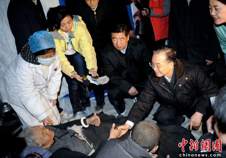 4月15日20時,中國國務院總理溫家寶來到青海省玉樹縣玉樹自治州醫(yī)院看望受災民眾。這是溫家寶握著一位藏族大媽的手問候其身體情況。國務院副總理回良玉、國務委員孟建柱參加看望慰問。中新社發(fā) 廖攀 攝