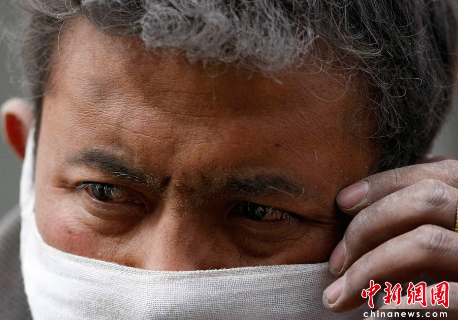 2010年4月16日,青海玉樹藏族自治州玉樹縣結古鎮一所中學的震災救援現場,救援人員的頭發、眉毛都落滿塵土。中新社發 盛佳鵬 攝