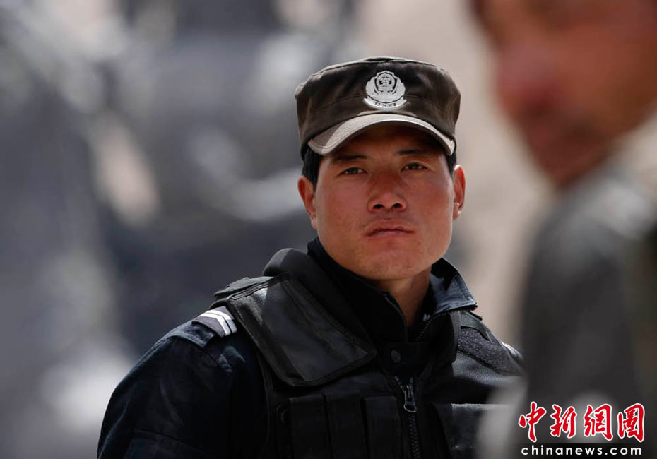 2010年4月16日,青海玉樹(shù)藏族自治州玉樹(shù)縣結(jié)古鎮(zhèn)格薩爾王廣場(chǎng),一名警察正在執(zhí)勤。中新社發(fā) 盛佳鵬 攝