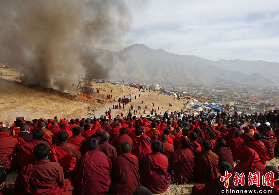 4月17日,青海省玉樹縣結古鎮附近的山坡上,眾多地震遇難者遺體被火葬。當日,為妥善及時處理遇難人員遺體,預防災區疫情的發生與流行,青海出臺地震遇難人員遺體處理意見,強調在處理遺體時要尊重少數民族喪葬習俗,尊重死者尊嚴。圖為眾多僧侶為逝者祈禱。中新社發 盛佳鵬 攝