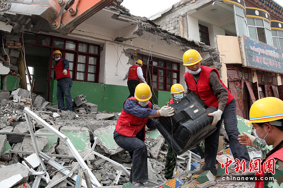 2010年4月19日,青海省玉樹縣結古鎮,一隊唐山農民志愿者為受災民眾在廢墟中搜尋他們的財物。他們曾經參加過汶川地震救援工作。中新社發 盛佳鵬 攝