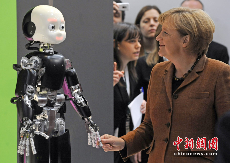 德總理工業(yè)博覽會上與機器人“逗樂”