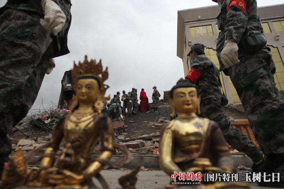 4月17日,青海玉樹結(jié)古鎮(zhèn)民主路,解放軍救援隊為受災民眾從房屋廢墟內(nèi)搜索出多件法器。中新社發(fā) 盛佳鵬 攝