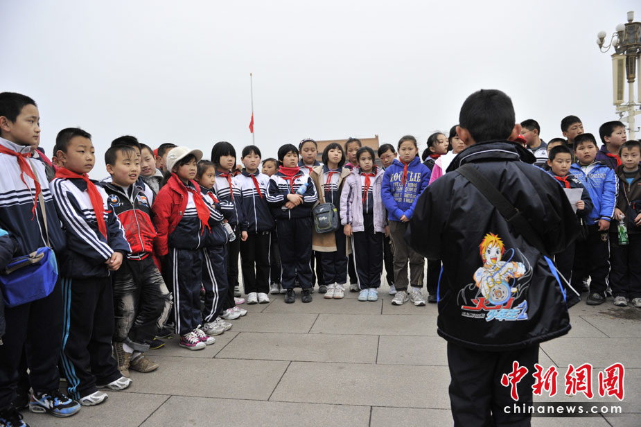 4月21日清晨,廊坊第十二小學的小學生來到天安門廣場朗讀自己的作文悼念青海玉樹地震的遇難同胞。中新網記者 金碩 攝