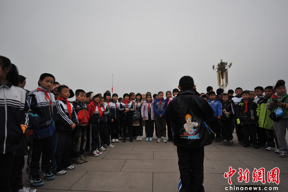 4月21日清晨,廊坊第十二小學的小學生來到天安門廣場朗讀自己的作文悼念青海玉樹地震的遇難同胞。中新網記者 金碩 攝