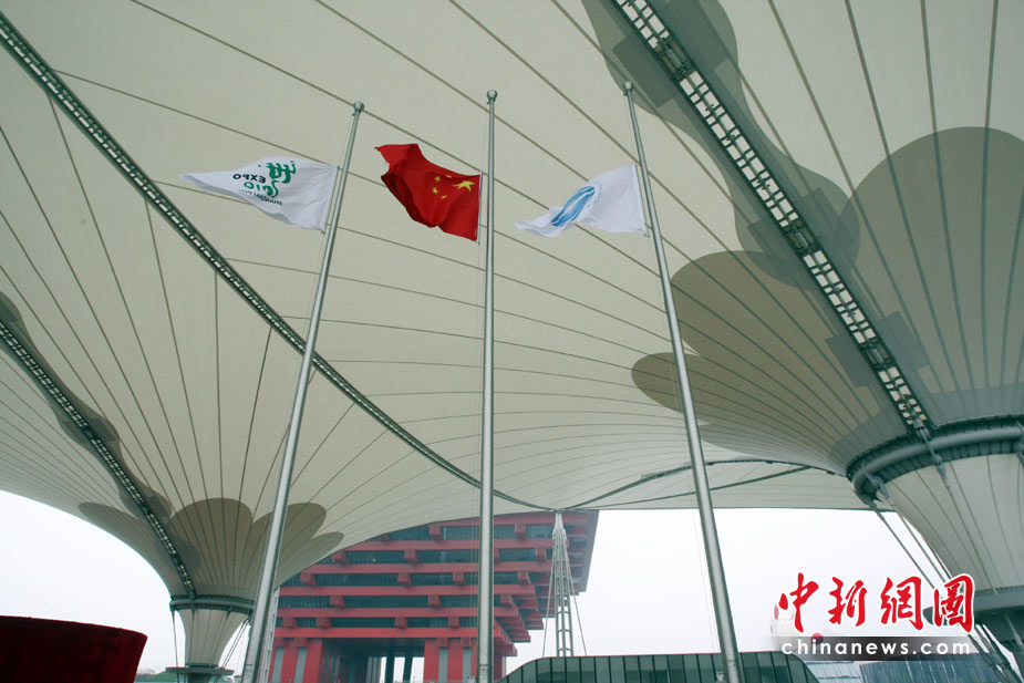 4月21日,上海世博園區降半旗哀悼玉樹地震遇難者。當日,全國舉行哀悼活動,深切哀悼青海玉樹地震遇難同胞。中新社發 湯彥俊 攝