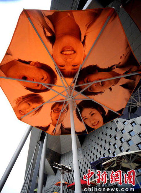 2010年4月22日,上海世博會(huì)主題館門前的觀眾等候區(qū),豎立著一把把遮陽的花傘,每一把花傘上都印著四方友人的燦爛微笑。世博園區(qū)為了應(yīng)對(duì)大量客流,園區(qū)設(shè)置了大量遮陽和避雨設(shè)施,遮陽避雨面積總量達(dá)40萬平方米。楊毅 攝(CFP)