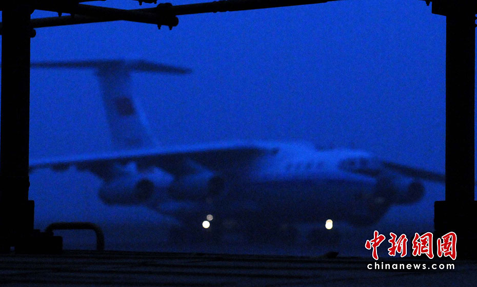 4月18日清晨6時 (賈國榮)天蒙蒙亮,中新社和中新網從北京增援采訪青海玉樹7.1級強烈地震的記者組,趕赴到成都某空軍機場,搭乘中國空軍伊爾-76重型運輸機037機群呼嘯起飛。