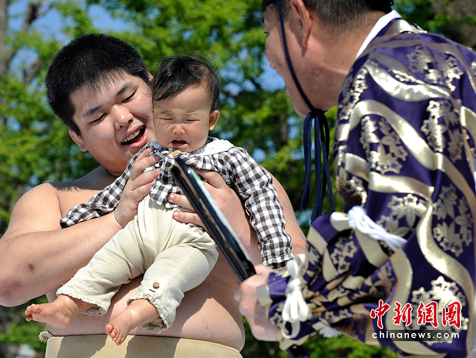 4月25日,日本東京,幾名相撲手手抱嬰兒,正努力使嬰兒哭泣。當日,一年一度的日本一周歲以下嬰兒啼哭大賽在東京淺草寺舉行。第一個讓嬰兒哭泣的選手將贏得比賽,日本通過此種比賽為孩子的健康祈福,他們認為嬰兒哭泣將對他們將來的身體健康有利。圖片來源:中國新聞網