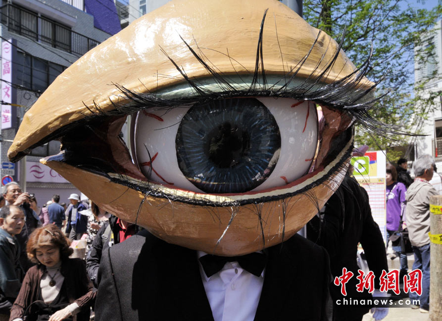 4月26日,日本一個表演藝術團體扮成“獨眼怪人”在街頭亮相,大玩行為藝術。