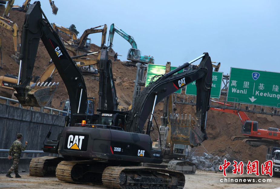 4月27日,臺灣“北二高”基隆段山體大滑坡意外第3天,開挖搜救風雨無阻、持續進行,消防部門陸續接獲民眾報告,疑似5車6人被深埋,包括兩輛奔馳轎車、一對年輕情侶。圖為軍方出動大型機械車參與挖掘工作。中新社發 董會峰 攝
