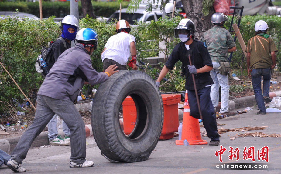 泰國(guó)防暴警察與紅衫軍示威民眾28日下午爆發(fā)沖突,1名士兵頭部被擊中身受重傷,10名示威民眾受傷送醫(yī)。