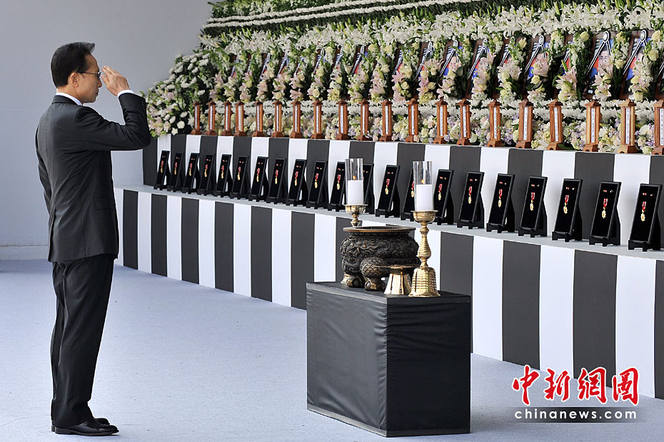 4月29日上午,韓國“天安”艦遇難官兵遺體告別儀式在平澤海軍第二艦隊司令部安保公園舉行。韓國總統(tǒng)李明博攜夫人參加告別儀式。圖片來源:中國新聞網(wǎng)