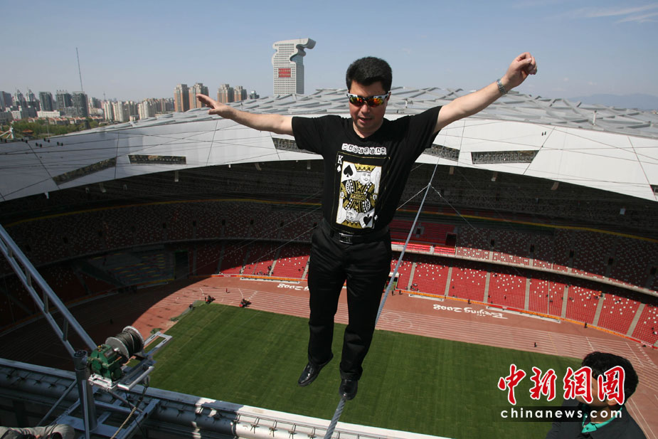 4月29日,有高空王子之稱的新疆小伙阿迪力在鳥巢上空成功試演達瓦孜(高空走鋼絲)。5月3日起,他將在北京國家體育場(鳥巢)頂棚上搭建的小屋生存60天,其間每天將進行約5個小時的高空走鋼絲表演。 中新社發 蘇丹 攝