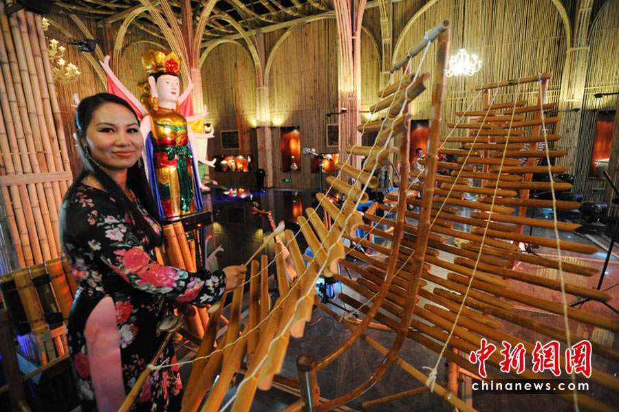 4月29日,演奏人員在越南館內演奏竹樂器為開幕演出精心彩排。秦淮 攝