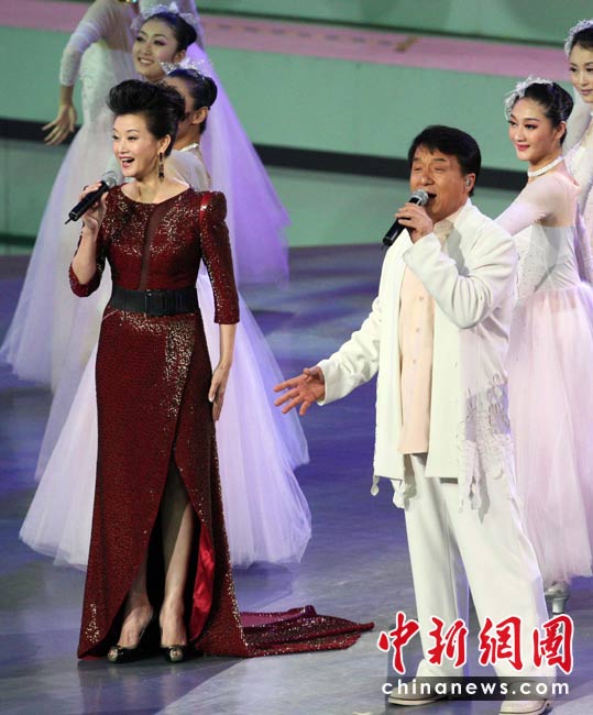 4月30日晚,上海世博會(huì)開幕式在世博文化中心舉行。圖為宋祖英、成龍聯(lián)袂獻(xiàn)唱。中新社發(fā) 湯彥俊 攝