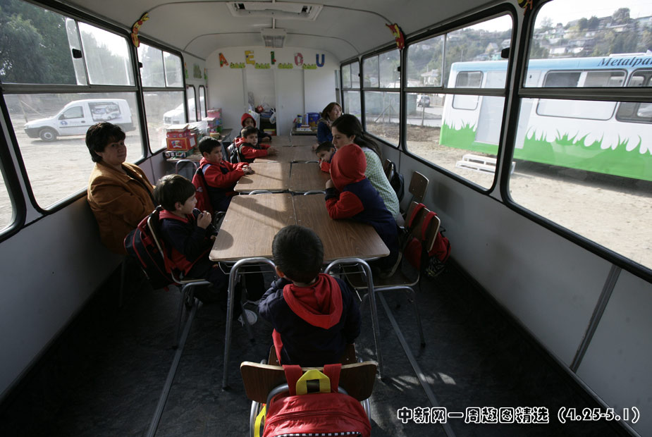 4月26日,今年2月遭受8.8級強烈地震的智利康塞普西翁市,兒童們在“巴士學(xué)校”里上課。圖片來源:中國新聞網(wǎng)>>點擊觀看詳細內(nèi)容