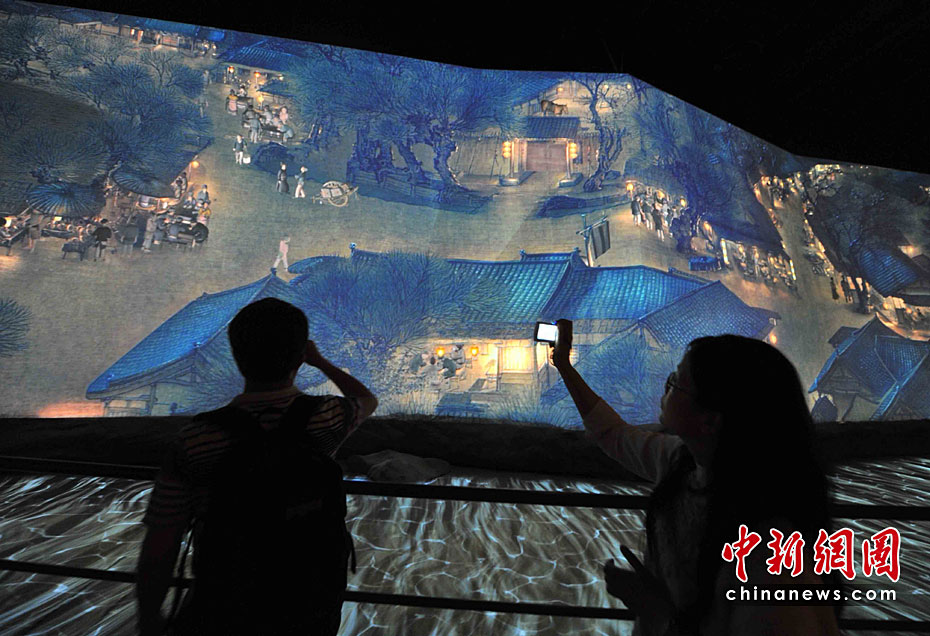 5月2日,中外觀眾依然最熱捧上海世博會(huì)中國館的“鎮(zhèn)館之寶”——巨幅放大電子動(dòng)態(tài)版的北宋畫家張擇端名作《清明上河圖》。此世博版的《清明上河圖》高6.3米,長130余米,約是原圖的30倍,需要12臺(tái)電影級(jí)的投影儀同時(shí)工作。整個(gè)活動(dòng)畫面以4分鐘為一個(gè)周期,盡展宋朝盛世的都市日夜風(fēng)情。中新社記者 賈國榮 攝