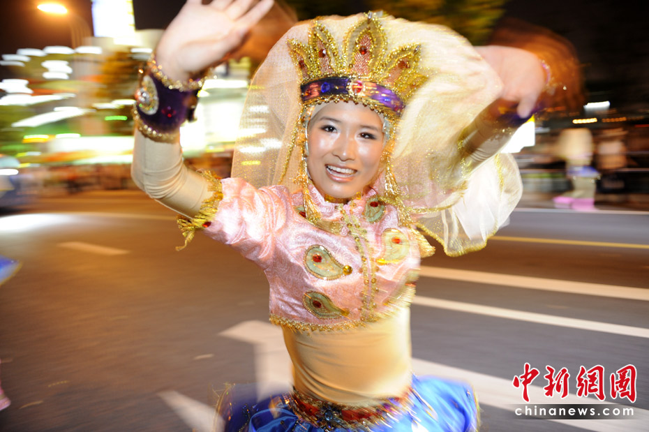 5月2日晚,由一輛輛充滿異域風情的花車和身著盛裝的表演者組成的“歡樂盛裝大巡游”在世博園區舉行。中新網記者 王紅綱 攝