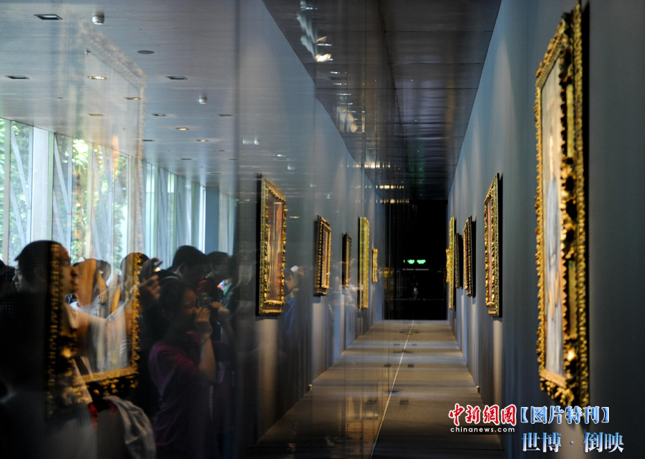 世博園法國館內,游客拍攝著玻璃罩內的國寶油畫。中新社記者 廖攀 攝