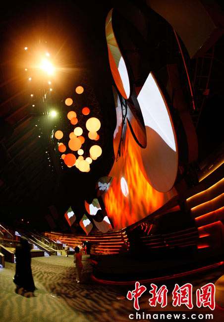2010年5月4日,上海世博園區(qū)迎來首個平日票的參觀客潮。圖為準(zhǔn)備好迎接游客的阿聯(lián)酋館的影院。中新社發(fā) 盛佳鵬 攝