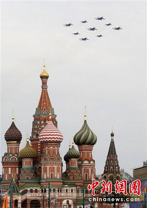 當地時間5月4日,在俄羅斯首都莫斯科,參加彩排的戰機編隊飛過紅場上空。俄羅斯將于5月9日隆重紀念衛國戰爭勝利65周年。圖片來源:中國新聞網