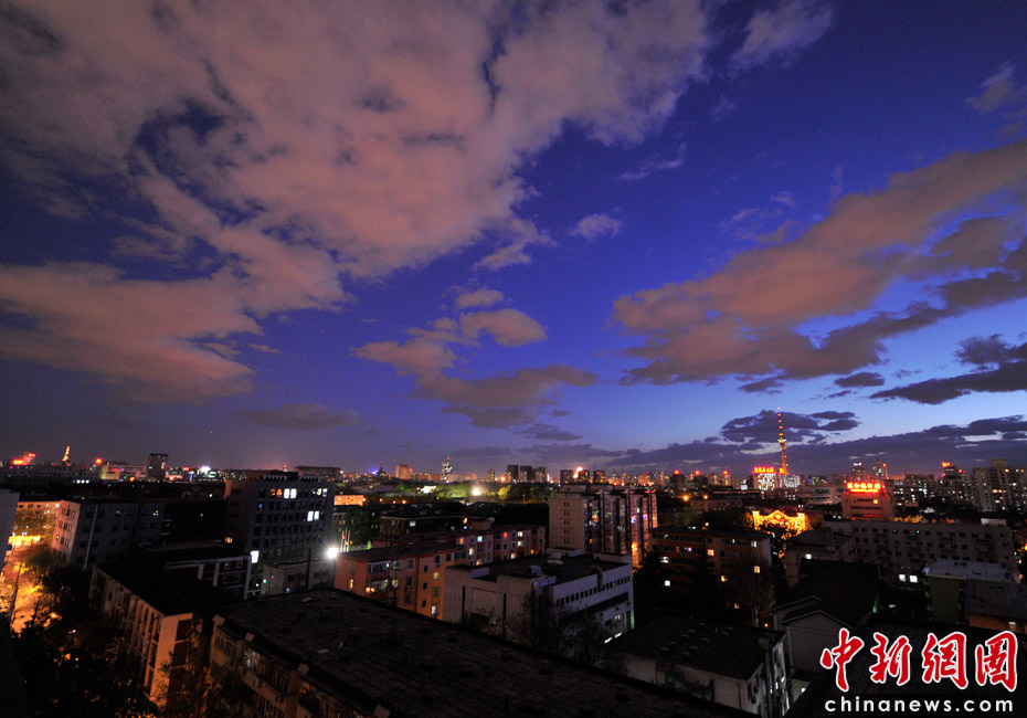 5月5日立夏,京城降雨今晨剛剛結束,霧氣伺機又起。傍晚時分,隨著四級北風的到來,京城天氣逐漸轉晴,霧氣慢慢消散天空彤云密布夜色瑰麗。中新網記者 金碩 攝