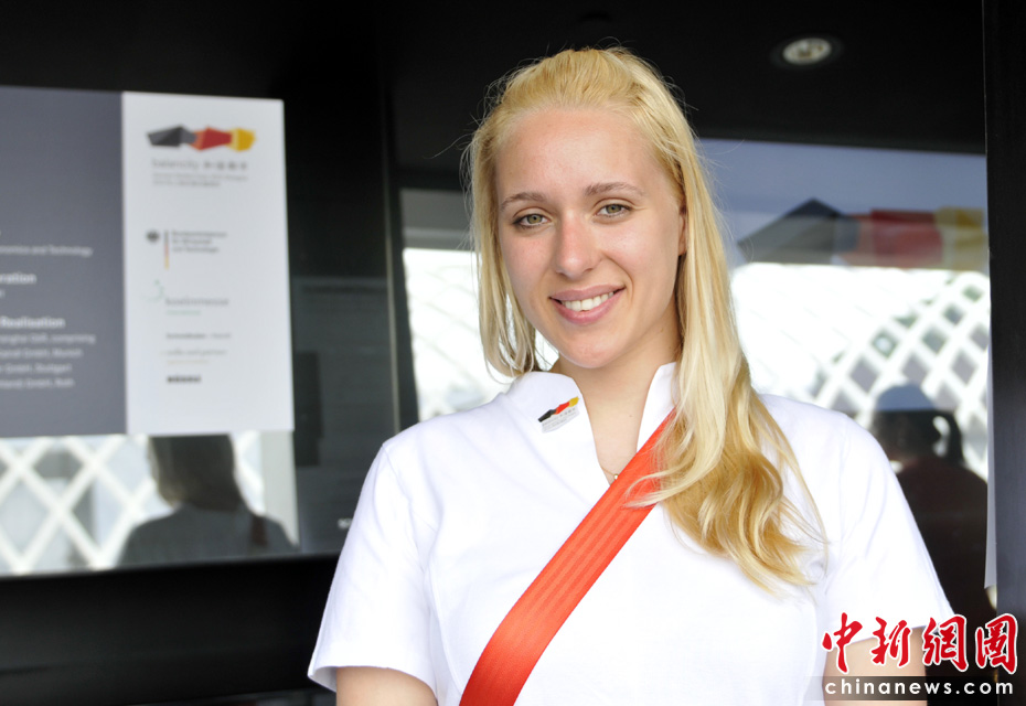 美麗的德國館工作人員,她們都能用一些簡單的漢語與中國游客交流。中新網記者 王紅綱 攝