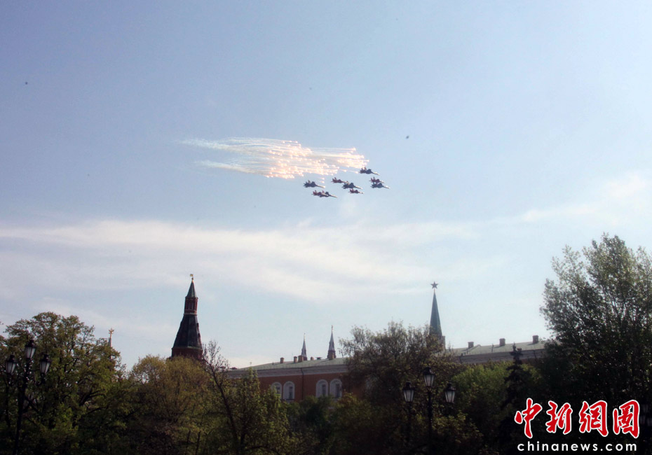 5月9日,俄羅斯在莫斯科紅場舉行盛大的閱兵式,慶祝衛國戰爭勝利65周年。莫斯科時間5月9日上午10點(北京時間9日下午2點)許,閱兵式正式開始。圖為空中梯隊飛越紅場上空。中新網記者 張朔 攝