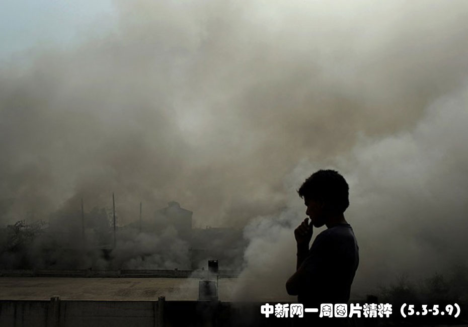 5月5日周三,在新德里,一名男孩看著冒煙的倉庫。目前還沒有傷亡報告。