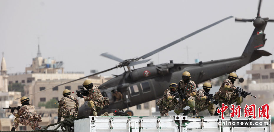 5月11日,約旦特種部隊(duì)在安曼空軍基地附近舉行演習(xí),為特種作戰(zhàn)部隊(duì)展覽會(huì)(SOFEX)開幕式助興。該展覽會(huì)為期4天,展覽主題包括國家安全及反恐措施。圖片來源:中國新聞網(wǎng)