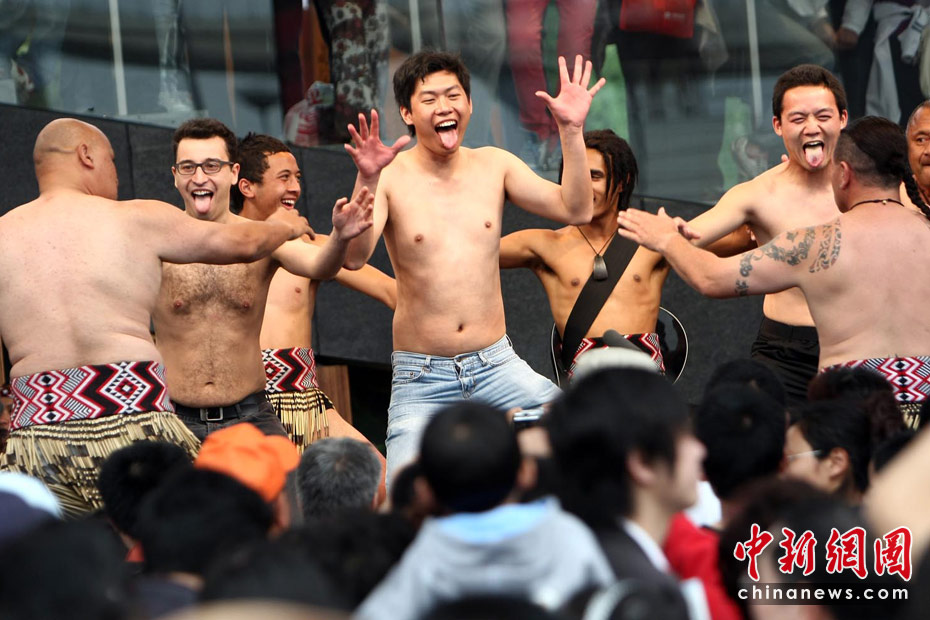 5月初,游客在上海世博會新西蘭館前赤膊上陣學跳毛利舞。中新社記者 杜洋 攝