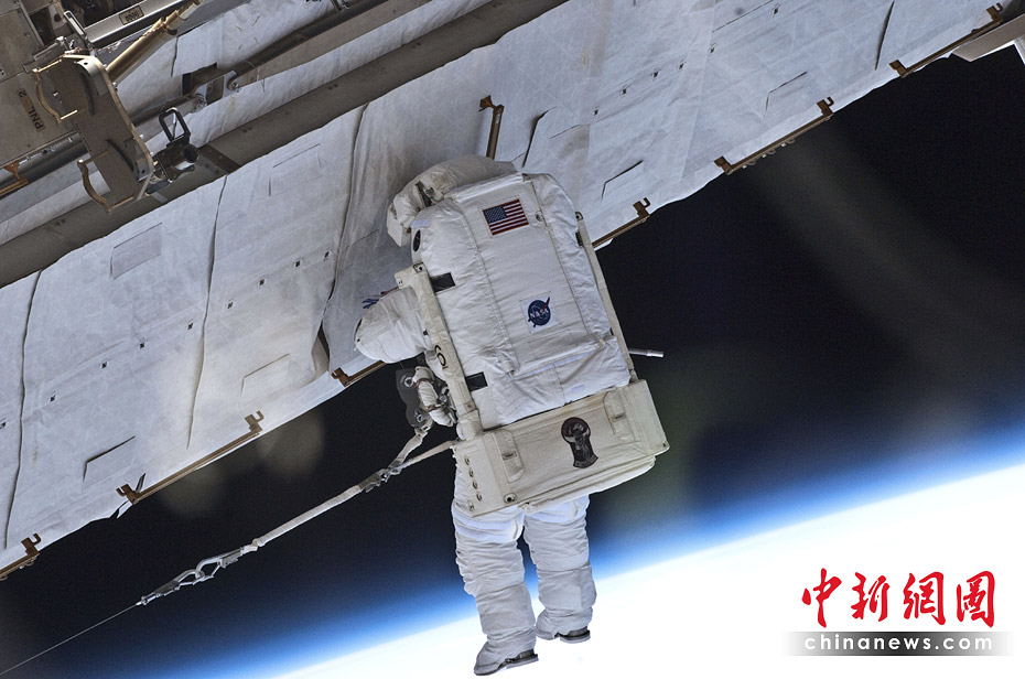 美國當(dāng)?shù)貢r(shí)間5月17日,“亞特蘭蒂斯”號航天飛機(jī)宇航員加雷特·賴斯曼和史蒂夫·鮑恩進(jìn)行了與國際空間站對接后的首次太空行走。圖片來源:中國新聞網(wǎng)