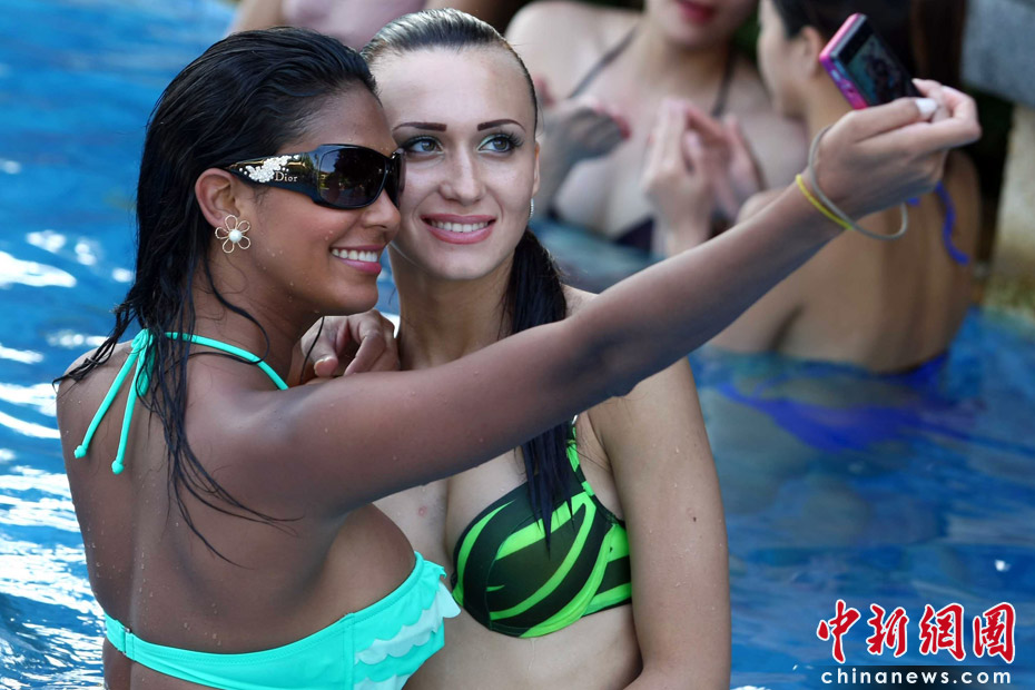 5月22日,一場沙灘趣味運動會在三亞海邊舉行,全球64位比基尼佳麗悉數登場,展現自己的運動天賦。中新社發 富田 攝