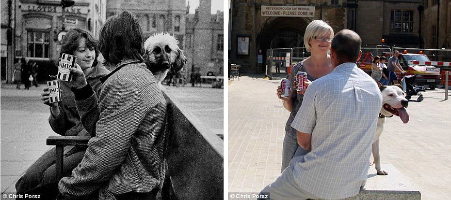 朱迪和戴夫在廣場的長椅上邊小憩邊喝冷飲,當時二人正在慶祝朱迪的21歲生日。30年過去了,他們已經是3個孩子的父母,身邊的寵物狗換了一條,夫妻倆的感情還是那么深厚。