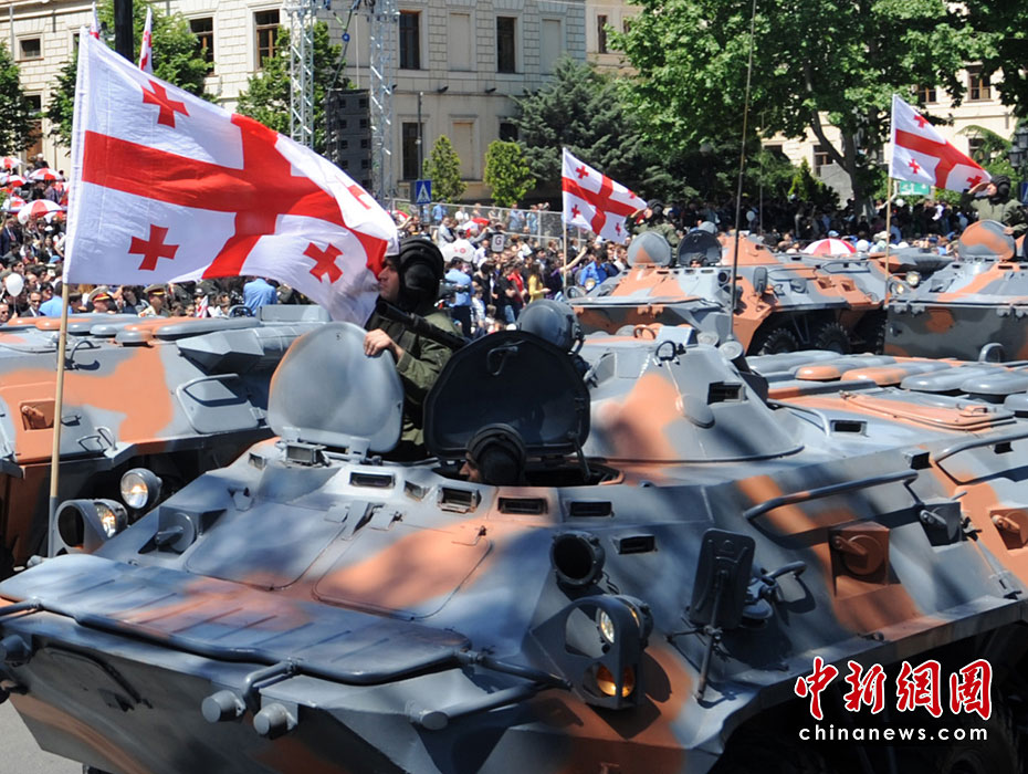 5月26日,在格魯吉亞首都第比利斯,受閱部隊從議會大廈前走過。當(dāng)日,格魯吉亞在第比利斯舉行慶祝格獨立日閱兵典禮,格總統(tǒng)薩卡什維利在議會大廈前檢閱軍隊并發(fā)表演講。圖片來源:中國新聞網(wǎng)