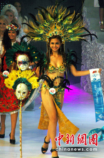 5月29日晚,第35屆國際比基尼小姐全球總決賽在三亞“美麗之冠”落下帷幕,22歲的羅馬尼亞選手Diana Irina Boanca摘得冠軍。總決賽還評選出了四季小姐,18歲的中國選手趙茜獲得“秋季小姐”,澳大利亞、委內瑞拉和拉脫維亞選手分別獲得春、夏、冬季小姐。共有來自世界各地的64位佳麗參加了總決賽的角逐。當晚,佳麗們展示了各自國家或地區特色的民族服飾,用不同的方式展示了不同風格的比基尼“秀”,性感迷人。 中新社記者 尹海明攝